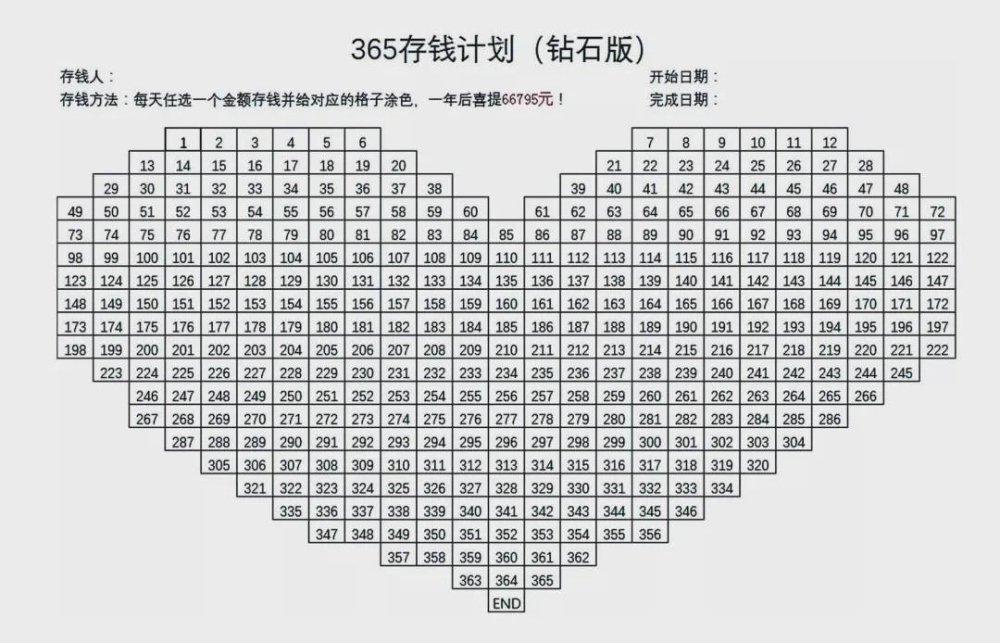 准备一个表格,在表格里按照数字从1数到365,每天按照相应的数字存一次,存钱的数字可以随机,存完就用颜色标记,一年下来可以存66795元。