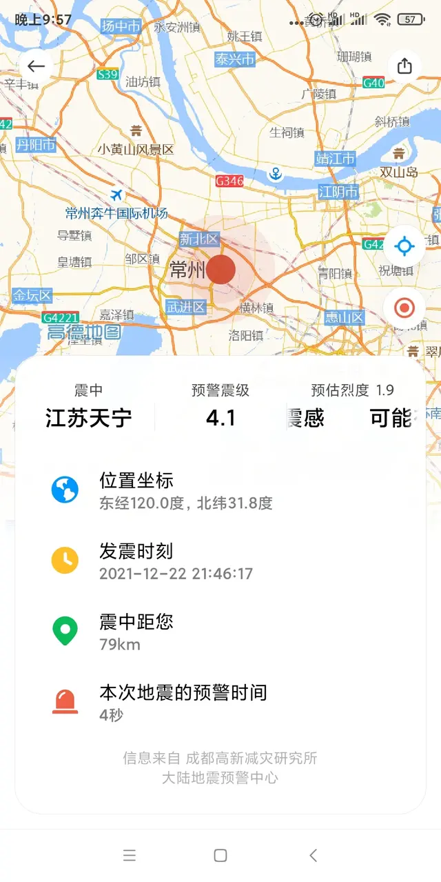 据中国地震台网正式测定,2021年12月22日21时46分在江苏常州市天宁区(北纬31.75度,东经120.00度)发生4.2级地震,震源深度10千米。附近的南京、上海、杭州等地都有震感,不少人都感觉到了摇晃,急急忙忙地从房间里跑了出来。