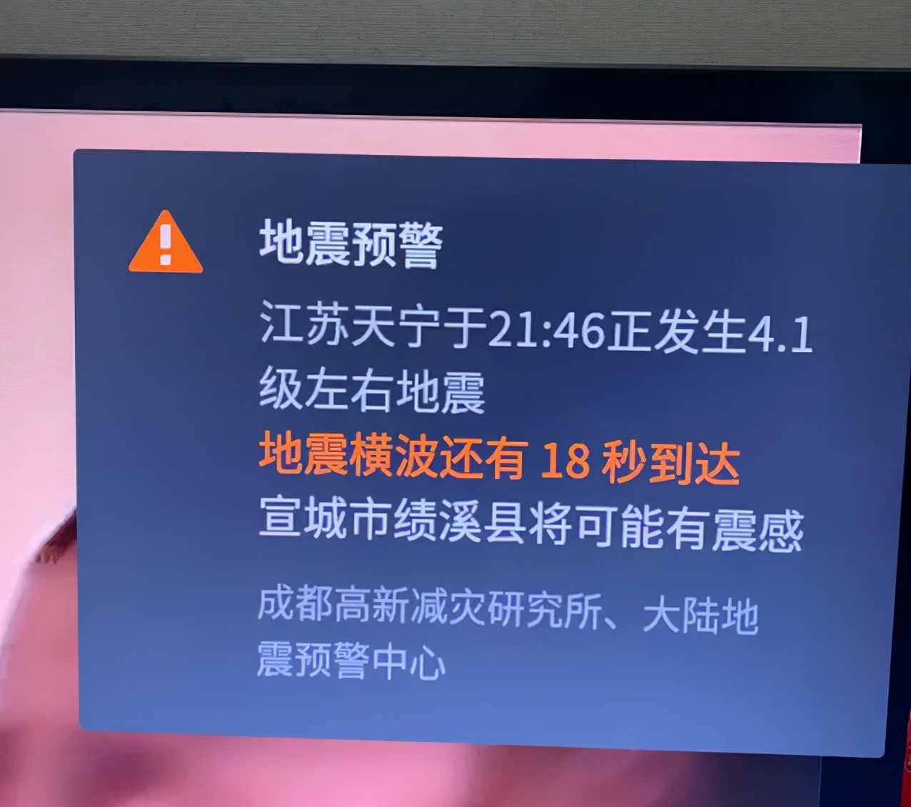 就目前来说,地震预报专家只能对某些特殊类型的地震做出一定的预测,但是绝大部分地震还是无法预报的,所以地震预警还是现如今防备地震的主要手段,目前我国已经有不少地震频发的地方安装了地震预警系统了,比如四川、云南、河北、安徽等地。 地震预警这次地震到达之前,成都高新减灾研究所(减灾所)与中国地震局联合建设的中国地震预警网成功预警此次地震,给南京市提前25秒预警,给苏州市提前12秒预警,给镇江市提前11秒预警,不少人发现自家的电视机和手机里出现了地震预警的信息。