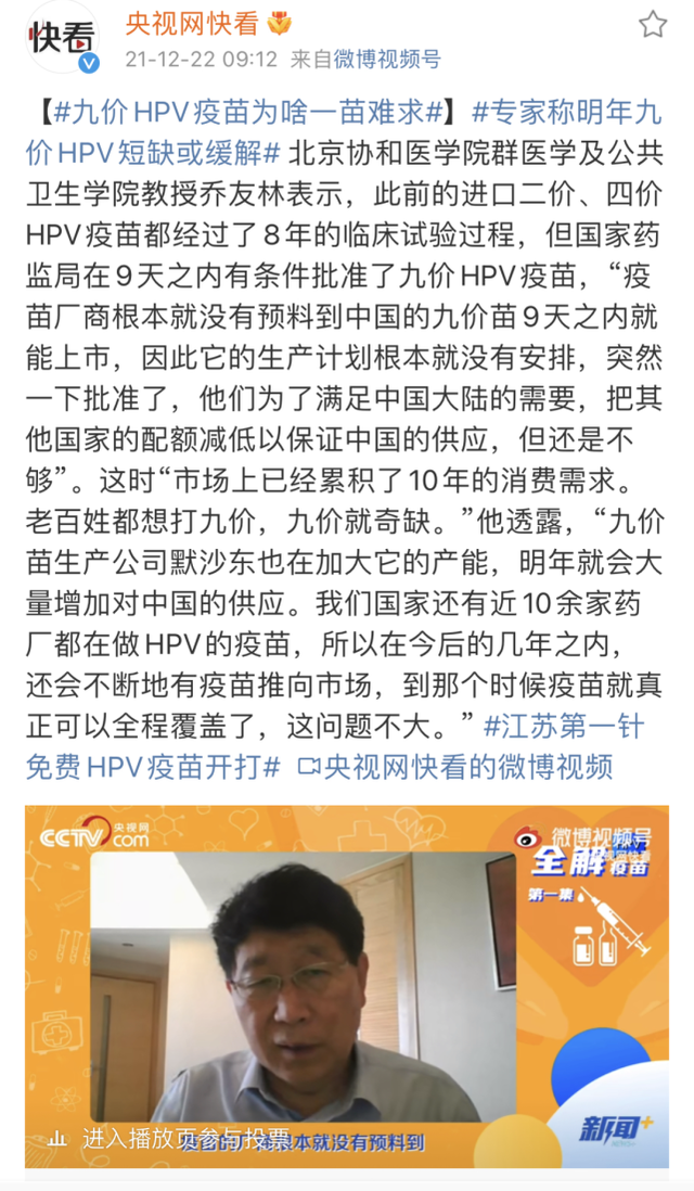 据了解,九价HPV疫苗的短缺与供应量有较大关系。