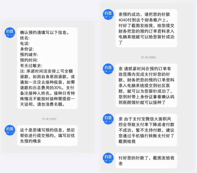 预约不成功可退款:骗子会作出“预约不成功可退款”的虚假承诺,以此来骗取受害人的信任,并要求受害人提供姓名、身份证、手机号等个人信息,以完成预约。骗子在收到受害人打来的预约金后,再发送早已准备好的预约成功虚假短信,接着要求付全款。