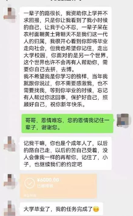 就在今年,谢洋大四很快就要毕业,冰哥打了6000块钱给谢洋,并告诉他说:我的任务完成了。