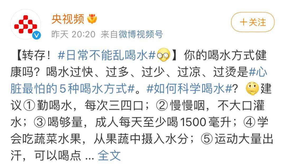 喝水,是个再简单不过,天生就会的动作。 健康确实也对喝水有一定的要求,只是有时听多了反而束手束脚不会喝水了。 今天的微博就有一个热搜话题「日常不能乱喝水」。 怎么喝水算是乱喝?哪些喝水要求有道理,哪些又不需要听呢?今天的今日热议,就来聊聊喝水。 图片来源:央视频微博 普通人要记得「喝够水」 水对人体非常重要,没有水,就没有生命存在。 所以,身体自己很清楚喝水的重要性,不会遮遮掩掩,需要的时候就会及时叫你喝水。如果你需要把更多精力用在其他地方,那在喝水这里请记住「渴了就尽快喝水」 。 如果要求更高点儿,有精力去想更健康地喝水,想要快身体一步喝水,尽量避免收到口渴信号,也可以了解基本的饮水量要求。不算来自于食物的水分,男性差不多需要每天 1700ml 的饮水,女性是 1500ml。 仅供参考,不需要准确测量。很多因素都会影响人体的需要, 天热、运动多、孕期需要就多一点儿。看好尿色,淡淡的黄色就说明够了的。 有些情况要「多喝水」 有时候,因为疾病的要求,对饮水量要求也高了,不能满足于只是不渴。 高尿酸血症建议多喝水,肾结石建议多喝水,反复尿路感染也建议多喝水。要比其他人喝得更多。倒也不必喝什么特殊饮品,比如虽然苏打水可能更有利于尿酸排泄,但也要考虑到负面,高尿酸就是多喝水就好,不需要特意喝苏打水。 「水」就是最好的水来源 这不是废话文学。 很多饮品都是水的来源。也许有时某些饮品对你确实有些好处,但综合评价下来,水,普通的水,符合饮用标准的水,不管是瓶装还是自家煮沸、过滤过后饮用水就是最好的水份来源。 图片来源:站酷海洛 很多家庭用水煮沸后会有水垢,是不是就容易导致结石,不能喝啊? 容易产生水垢的水,相对有更丰富的钙、镁元素,称之为「硬水」。硬水喝起来或者做饭用,口感都会逊色一些,但并不会增加结石风险,也没有其他健康危害,还能多补一点儿钙镁。只要能接受口感就能畅饮。 这些「水谣言」不是真的 吃饭时不能喝水。能喝。 要按照饮水时间表来喝水。不需要那么严格地按时喝水。 碱性水更有利于健康。水不需要分酸碱,不需要改善酸性体质。 瓶装纯净水没有微量元素不能喝。纯净水确实没有那些元素,但平时我们也不指望靠喝水补充微量元素,吃饭才是主要来源。 婴幼儿要喝特殊的婴儿水。水就是水,孩子饮水卫生要求跟大人一样。 好好喝水吧。 图片来源:SOOGIF