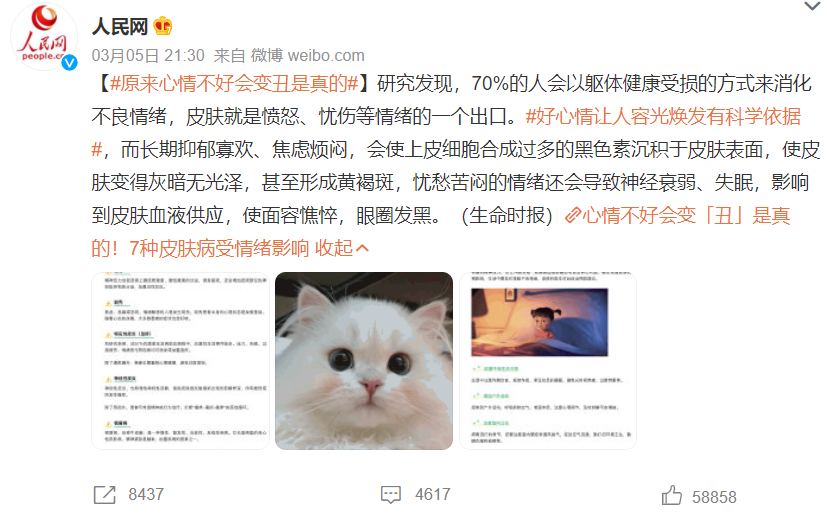 好的心情会让皮肤容光焕发,而不良情绪则会通过影响皮肤拉低颜值。