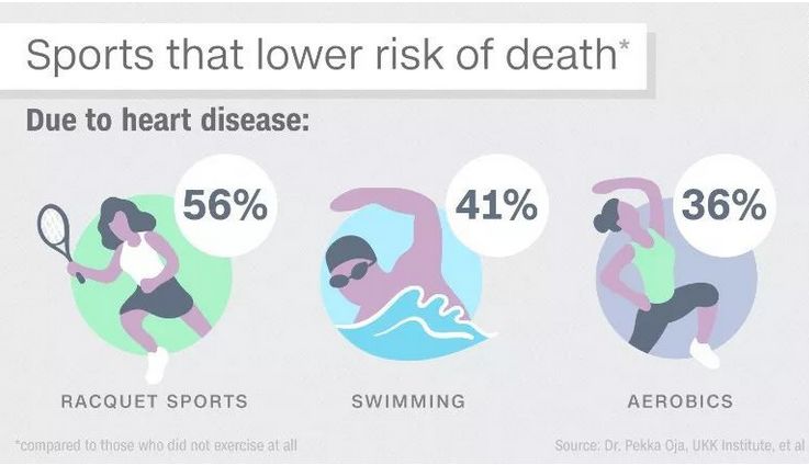 保护心血管 上述《柳叶刀》杂志刊登的研究发现,在保护心血管、在降低心血管疾病死亡风险方面,乒乓球、羽毛球等挥拍运动名列第一。