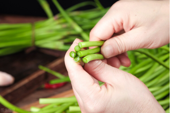 用手去下一下蒜苔的根部,如果其根部是又绵、又老的话,那么这样的蒜苔就别购买。因为它的口感已经不脆了,那些轻轻一掐就断的蒜苔,口感才是最脆的,也最适合购买。