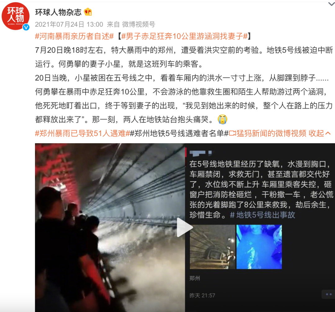 一桩桩,一件件。 故事千人千面,感动一如既往。 2021年7月20日,那是一个很多人不愿提起的日子。 河南暴雨。 郑州地铁5号线被迫中断。 何勇算是幸运的,那天他不在地铁上。 可命运往往就是这么爱捉弄人,何勇的妻子小星,就是这班列车的乘客。 那天的情形,后来大家都知道了—— 车厢进水,洪水一寸寸上涨,很快水漫到胸口。 车厢紧闭,求生无门,人开始缺氧……