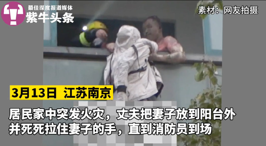 为了拖延时间,争取消防救援,夫妻俩被逼到了阳台。 然而,火势蔓延太快。 摆在夫妻俩面前的,似乎只剩下两条路: 同生共死,一起蜷缩在角落,但可能双双丧命,无法活着等到救援。 或者牺牲一个人,托举住另一个人,争取活命的机会。 丈夫选择了第二种。 他让妻子站在阳台外,自己留在阳台内,死死地抓住妻子的胳膊。