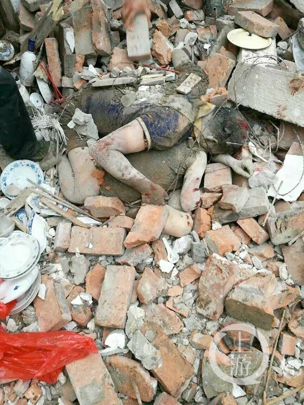 在这张照片里,63岁的韦其龙趴在地上。 只有右胳膊裸露在外,其余身体部位全部被砖瓦覆盖。 可以想象,在死亡来临之前,他经历了怎样一场浩劫。 在他身下,是被死死护住的妻子李桂兰。 夫妻二人,双双遇难。 这样的情景已然令人心碎,然而扒开砖瓦,更让人热泪盈眶的一幕映入眼帘: 韦其龙的左手,罩在了妻子的头上。 都说照片是静态的,不会说话,但这张照片,蕴含了万语千言。