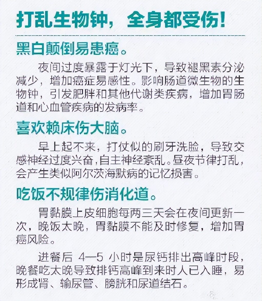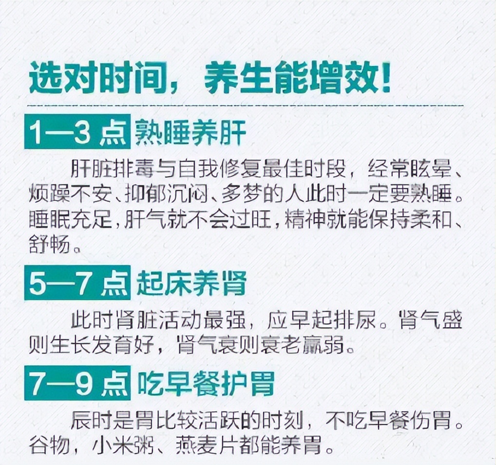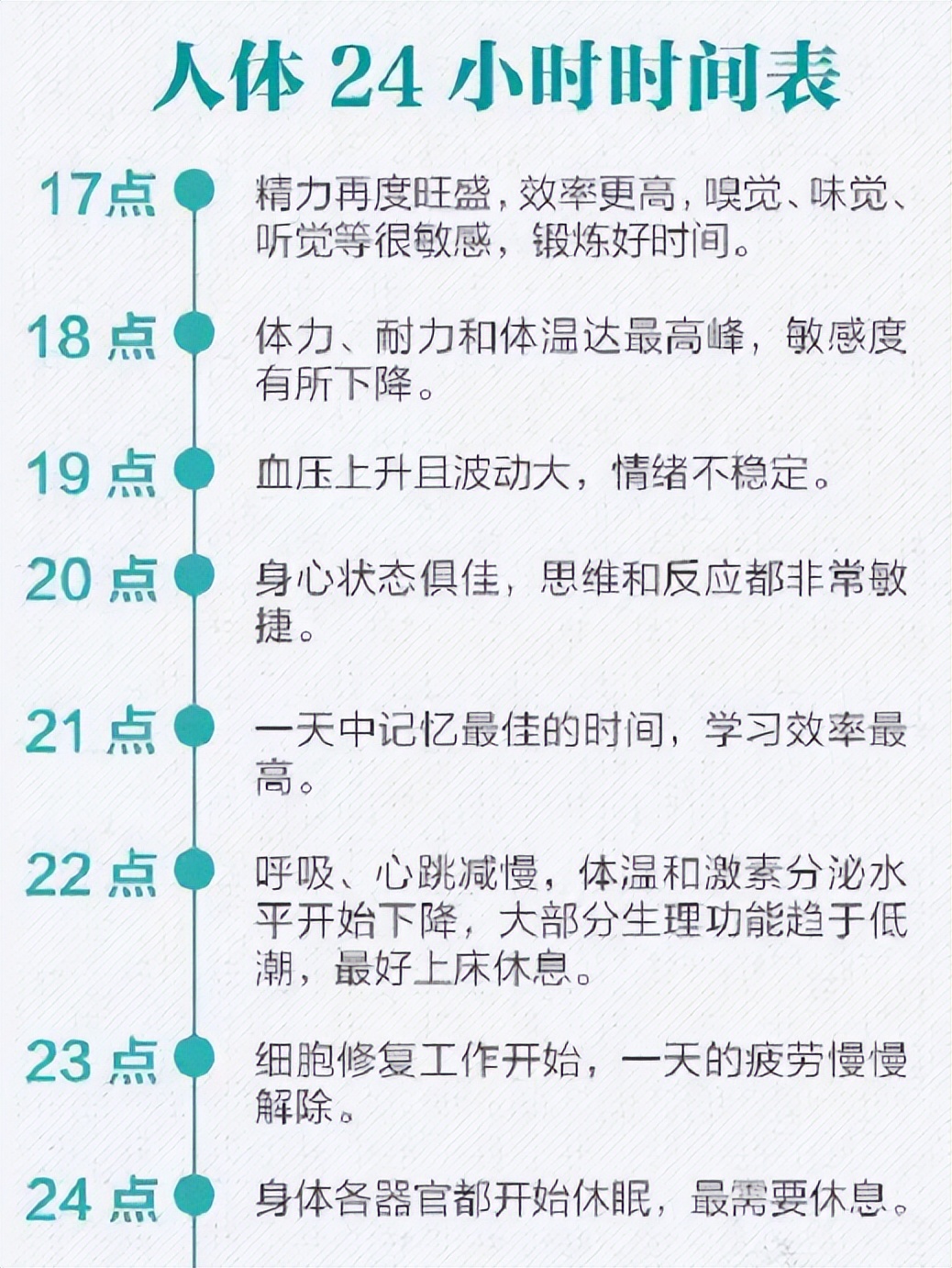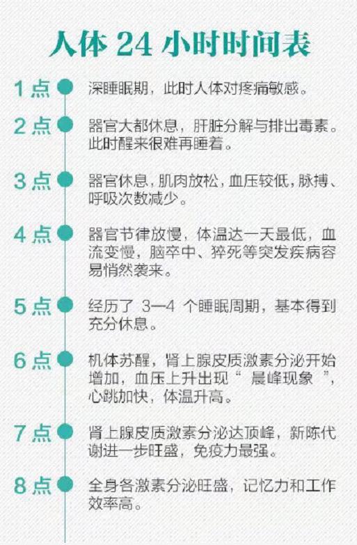 专家建议,美容保养若能与皮肤自然作息时刻相配合,就可发挥它最大的功效,晚上11点至凌晨5点,细胞分裂的速度要比平时快8倍左右,能使皮肤保养和修复达到最佳效果。 早晨6点至7点,肾上腺皮质激素的分泌此时达到高峰期,它抑制蛋白质合成,而且再生作用减慢,细胞的再生活动降到最低点,水分聚集于细胞内,淋巴循环缓慢,一些人会眼皮肿胀。 医生公布人体24小时时间表,你知道每个时间段对身体的重要性吗?