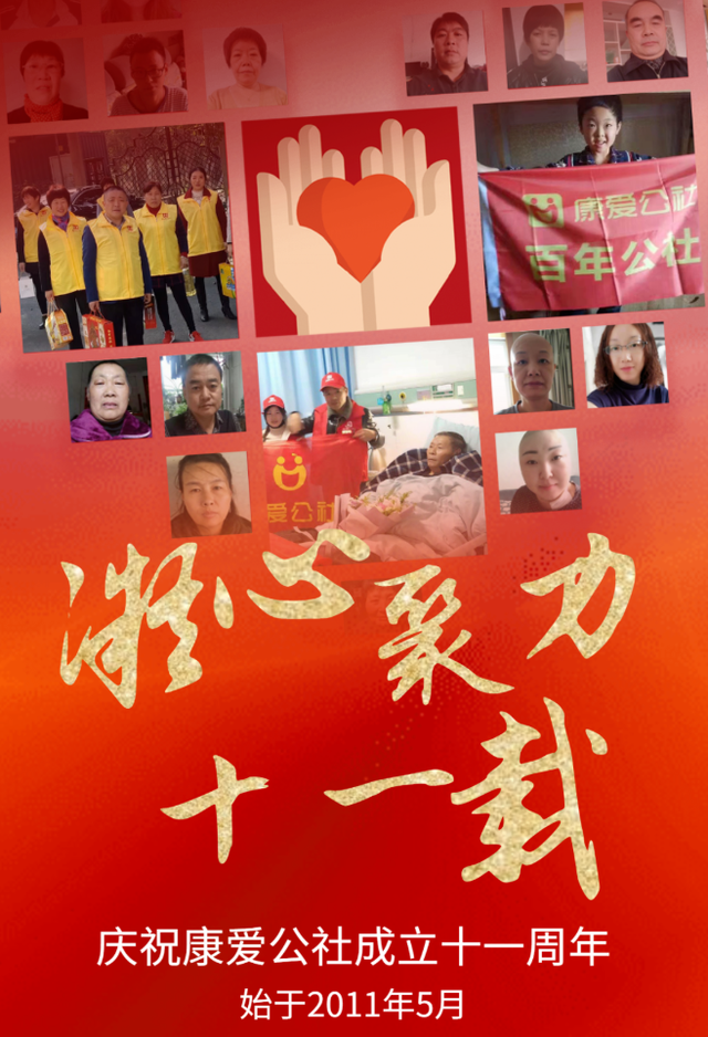 康爱公社创始人张马丁先生因母亲患癌去世, 深切体会到一人大病给一个家庭带来的经济压力与心灵创伤, 创办康爱公社,希望缓解更多人因高额大病医疗费而带来的焦虑。 5月8号,康爱公社就11岁啦! 十一年来,公社稳健运营,专注互助, 让一个又一个不幸的家庭,在绝望中看到了希望!