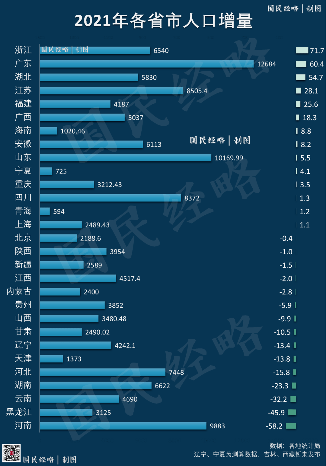 在国家统计局发布2021年人口数据后,各地也陆续发布了当地数据。 第一财经梳理发现,截至目前,31个省份已全部发布了2021年常住人口数据,31个省份中,有16个省份常住人口出现下降,15个省份常住人口增长,其中浙江、广东和湖北增量位居前三。同时,截至目前,有27个省份公布了2021年出生人口数据,广东自2018年开始已连续多年出生人口最多。此外,还有11个省份人口出现自然负增长。 01 16个省份常住人口负增长 数据显示,31个省份中,共有15个省份2021年常住人口实现增长,这其中,位居前5的是浙江、广东、湖北、江苏和福建,包括了东南沿海四个经济发达省份和疫情后全面复苏的中部省份湖北。 可以看出,过去1年,全国超过一半省份人口负增长,而年度人口增量超过50万的省份仅剩3个。 全国人口增长最多的5个省份,全部都在南方: 浙江(71.7万)、广东(60.4万)、湖北(53.7万)、江苏(28.1万)、福建(25.6万)。 这其中,湖北作为黑马,脱颖而出。 这是后疫情时代人口回流所致。2020年疫情,让湖北一度流失了150多万人口,按照目前的回流速度,湖北人口规模,仍未回到疫情之前的水平。 数据显示,2021年湖北常住人口5830万,相比疫情之前2019年的5927万,少了近100万。 而浙江一跃成为人人口增量最多的省份。 浙江以72万人的增量位居第一。人口增长包括自然增长和机械增长(即人口净流入)。按照自然增长率计算,去年浙江的自然增长人口仅有6.5万,也就是说去年浙江新增净流入人口达65.5万人。 02 多省人口数量下降 有16个省份常住人口出现下降,占比超过一半。其中有10个省份减少的数量超过10万人,河南、黑龙江和云南减少数量位居前三,辽宁、吉林、湖南减少数量也都超过了20万人。总体来说,人口下降的省份主要来自东北、华北、西北和中部地区。 未来常住人口负增长的省份可能还会继续增加。目前我国人口的空间优化布局仍在继续,城乡人口布局、区域性的人口布局仍在变化,一些经济发达、经济高地会集聚更多的人口,这些地方占全国人口的比重会越来越高。一方面,人口仍在向东南沿海地区集聚;另一方面,一些省份虽总人口在下降,但省会城市人口仍在增加。 当然,人口形势最严峻的仍旧是东北。 黑龙江,在过去10年减少646万的基础上,2021年再次减少了46万人。 这意味着,过去11年,整个黑龙江省的人口规模萎缩了近1/5,包括哈尔滨在内的所有地市,无一幸免。 而这一切,还只是开始。 03 我国11省份人口出现自然负增长 5省首次转负 在出生率方面,已公布数据的27个省份中,共有4个省份超过了1%即千分之十,分别是西藏、贵州、宁夏和青海,均来自西部地区。另外,广西、甘肃、广东和云南超过了千分之九。江西、福建、河南出生率达到或超过了千分之八。 通常来说,人口出生率较高的地方,往往是城镇化率较低的地方。比如西部地区和中部的江西、河南。 不过,有两个省是例外,即来自东南沿海的广东和福建,整体出生率也较高,这其中主要原因是广东的潮汕、福建的闽南等地区受传统的宗族文化因素影响,生育文化意识较浓,生育意愿较高。 相比之下,出生率较低的地方,主要来自东北、华北、长三角以及城镇化率较高的重庆等地。其中,上海、江苏和东北的吉林、辽宁、黑龙江出生率均已低于千分之六。 从人口自然增长率来看,26个省份中,共有11个省份人口出现自然负增长,分别是黑龙江、吉林、辽宁、重庆、内蒙古、湖南、江苏、上海、湖北、河北和山西。其中,江苏、湖北、湖南、内蒙古和山西均是近几十年来人口自然增长率首次转负。 这其中,东北的黑龙江人口自然增长率为-5.11‰,同期辽宁为-4.18‰,吉林为-3.38‰。其中,吉林自2018年开始连续多年人口出现自然负增长,黑龙江则已经连续7年人口出现自然负增长。 东北的出生率低,有两方面因素,一方面是产业结构因素。由于老工业基地衰退,产业比较老旧,加之产业结构以重资本型的重化工业为主,对劳动力的吸纳能力较差,所以导致年轻人口外流。年轻人外流后,出生率也会下降。 另一方面,也与历史惯性、人口结构有关。东北工业化和城镇化早,计划生育执行严格,独生子女占比大,这批独生子女现在是东北生育的主体,因此出生率也会较低。 (第一财经)