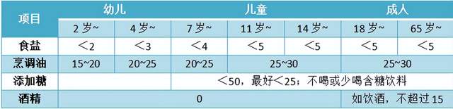 不同人群食盐、烹调油、添加糖的推荐摄入量和酒精的控制摄入量(单位:克/天)