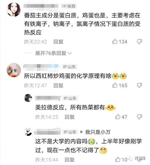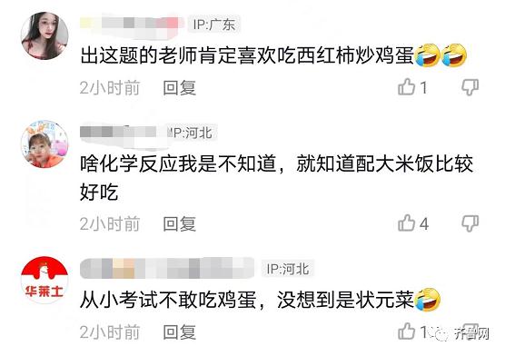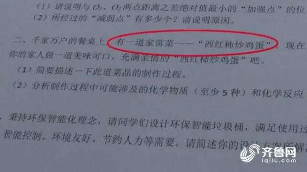 西红柿炒鸡蛋分几步? 炒菜中会产生哪些化学反应?  小编可不是在找茬啊, 这可是真是一道面试考题呢…… ▽ 5月23日, 山东省实验中学 2022年推荐生选拔综合素质面试结束。 在选答题中, 一道关于“西红柿炒鸡蛋”的题目 让不少考生印象深刻。  “请同学们扎好围裙走入厨房,为你的家人做一道美味可口、充满亲情的‘西红柿炒鸡蛋’吧。”题目要求简要描述制作过程,并分析可能涉及的至少5种化学物质和至少1种化学反应。 记者采访时, 多名考生表示并不会做菜, 这道看似“接地气”的题目, 其实挺难。 我在家几乎没做过菜,只会做煎荷包蛋。 我从来没有独立做过西红柿炒蛋,实在写不出这道菜的步骤,所以只好放弃了。 当然, 也押到“题”的幸运考生: 平常在家里经常自己做饭,做的最多的菜就是西红柿炒鸡蛋。  但是, 这道题不但要求会动手劳动, 还要会分析化学物质和化学反应, 这就又让不少孩子们 望而却步了。 我觉得学校出的这道题接地气又巧妙,但我搞不太清楚这道菜的化学原理。 不少网友也跟着懵了, “西红柿炒蛋”啥化学反应不知道, 就知道配大米饭好吃……    还有网友肯定出题: 全面发展,可以有~     更有网友在线答题, 怎一个厉害了得!   事实上, 这道看似有点“奇葩”的考题, 正是今年推荐生考试中 最具特殊意义的考题之一。 在教育部近期发布的《义务教育劳动课程标准(2022年版)》中,要求五六年级学生学会制作2-3道家常菜,西红柿炒鸡蛋就是示例之一。 “化学源自生产生活, 又为生产生活服务, 认识化学,并通过化学改造物质, 利用物质为人类造福是化学的核心。” 山东省实验中学副校长范海沛表示, 考试不拘泥于教材, 考查和培养学生知识迁移能力与综合应用能力, 这也是学校的育人方向。 这道考题 也从侧面释放了一个信号, 或许将来会有更多的“劳动教育”题目 陆续出现在考题中。 齐鲁网·闪电新闻综合 来源: 齐鲁网