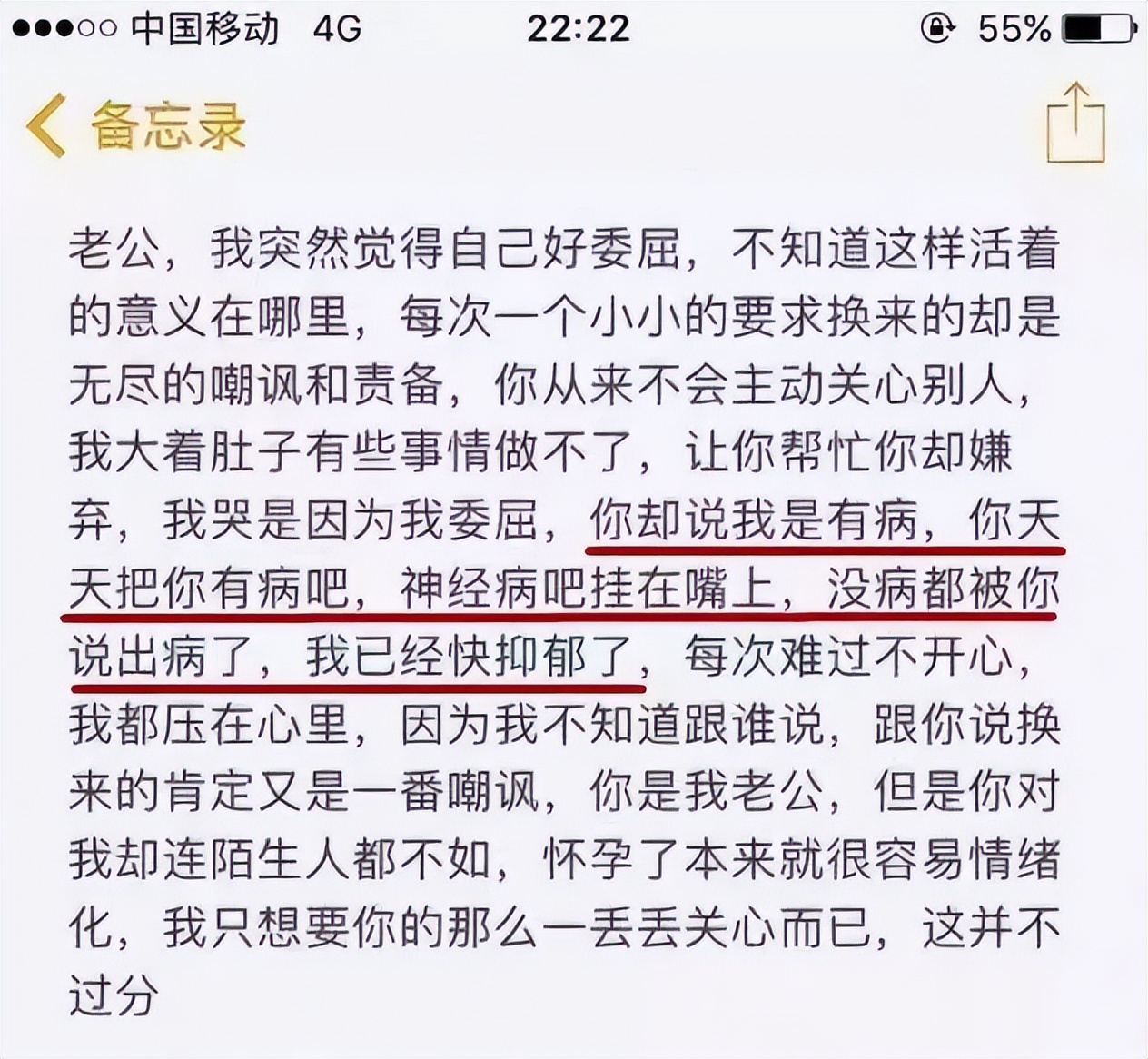 前几天,看到一则新闻,我久久不能平静。 一位32岁的二胎妈妈,突发心跳呼吸骤停,在坐月子期间猝死。 家人从手机里选遗照时,无意间看了一眼她的备忘录,才发现这件事另有隐情。 原来,这位妈妈去世前,不止一次向老公求助。 但无论她说什么,如何委屈,都无法换来对方的理解: 每次一个小小的要求,换来的却是无尽的嘲讽和责备。
