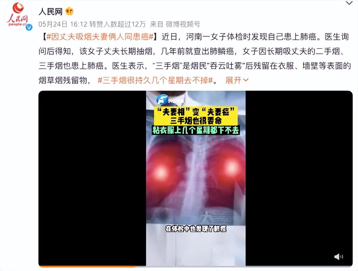5月31日是世界无烟日。吸烟是导致肺癌的重要因素之一,长期吸烟的人群患上肺癌的风险相对较高。 世界卫生组织国际癌症研究机构(IARC)发布的2020年全球最新癌症负担数据显示: 2020年全球癌症死亡病例996万例,其中肺癌死亡180万例,位居癌症死亡人数第一。2020年中国癌症死亡人数300万,肺癌死亡人数高达71万,占癌症死亡总数的23.8%。 肺癌分为两大组织学类型,小细胞肺癌(SCLC)和非小细胞肺癌(NSCLC)。其中NSCLC占比约85%左右。肺癌容易出现转移,常见转移部位包括肝脏、脑部、骨、胸膜、淋巴结等等。只要发生转移了就属于晚期。肺癌越早发现越早治疗,生存率越高。 图库版权图片,不授权转载而对于吸烟者身边的家人朋友来说,他们同样也在承受着烟对身体的伤害。 一女子的丈夫长期吸烟,几年前查出了肺鳞癌。近日,该女子在体检时发现自己也患上了肺癌,而这与她长期吸丈夫的二手烟、三手烟密切相关。 微博截图夫妻双双患上了肺癌,难道这癌症还会传染吗?哪些人易患肺癌呢?往下看。 肺癌高危人群有哪些? 《中国肺癌筛查与早诊早治指南2021》指出,肺癌高风险人群应符合以下条件之一: 1、吸烟:吸烟包年数≥30,其中也包括曾经吸烟包年数≥30,但是目前戒烟时间不足15年; 2、被动吸烟:与吸烟者共同生活或者同一较密闭环境工作≥20年; 3、患有肺结核、慢性阻塞性肺疾病; 4、有职业暴露史(石棉、铬、硅、煤烟、煤烟尘暴露)至少1年; 5、父母、子女及兄弟姐妹一级亲属确诊肺癌。 注:吸烟包年数=每天吸烟的包数(每包20支)×吸烟年数 对于肺癌高风险人群,该指南推荐采用低剂量螺旋CT(LDCT)进行筛查,推荐筛查年龄为50-74岁。 而《肺癌筛查与管理中国专家共识(2019)》中,对年龄更加严格要求,40岁以上的人群应进行肺癌筛查。且吸烟量为20包年,也就是我们以前所说的吸烟指数超过400,就应该主动筛查。 同时,目前我国二手烟问题严重,被动吸烟20年以上者也应进行肺癌筛查。 图库版权图片,不授权转载接触肺癌患者会不会被传染? 首先需要明确的是,肺癌不是传染性疾病。 传染性疾病必须具备三个因素,即传染源、传播途径和易感人群,这三个条件缺一不可。 根据目前的临床医学验证,癌症是不具备传染性的,癌症病人更不是传染源。所以日常生活中接触肺癌患者并不会患癌症。 而一些“夫妻癌”“兄弟癌”的出现,主要是因为长期一起生活的人群如果存在不良生活习惯、不合理的饮食结构等,那么他们共同患病的几率就会大大增加。 那么肺癌会遗传吗? 遗传因素在肺癌的发生和发展中具有一定的作用。如果家族中有癌症患者,那么在相同的致癌因素的刺激下,后代得癌症的几率一般会大于别人。 肺癌早期为何不易被发现? 提起肺癌,很多人会立刻想到咳嗽、咳血等症状。其实早期肺癌一般没有症状或症状不明显,非常容易被忽视。 大多数单位体检的时候,都是使用胸片检查。胸片分辨率低,漏诊率高,对于两厘米以内的结节或者是横膈处的病变都有较大的概率会漏。 图库版权图片,不授权转载相比于胸片,胸部CT就像把面包切成片之后,一片片地观察,可以使器官和结构清楚显影,清晰地显示较小的病灶,能发现几毫米的微小病灶,也能发现位置不好的肿瘤,可以弥补普通胸片拍照的缺失。 有没有必要每年做一次CT? 早期肺癌的筛查一定要区分高危人群和低危人群。 针对上述提到的肺癌高危人群,建议每年进行一次低剂量CT筛查。 对于低危人群,第一次CT筛查结果如为阴性,且一直保持健康的生活方式,没有必要每年检查,根据不同的年龄段可以选择每3年、5年、10年再进行CT筛查。 预防肺癌,做好这八条: 避免主动及被动吸烟,要劝亲戚朋友戒烟; 室内要常通风和透气,使用优质的油烟机; 空气污染特别严重时,出门戴防护型口罩; 有职业暴露风险的人,一定做好防护措施; 多吃新鲜蔬菜和水果,不吃发霉变质食物; 作息规律要好好睡觉,积极科学锻炼身体; 心态乐观开朗很重要,要少生闷气多笑脸; 有肺癌高危因素的人,定期筛查及时治疗。 本文专家:胡忠东,长沙市第三医院健康管理中心主检医师,副主任医师,湖南省医学教育科技学会青年科普创新专业委员会委员