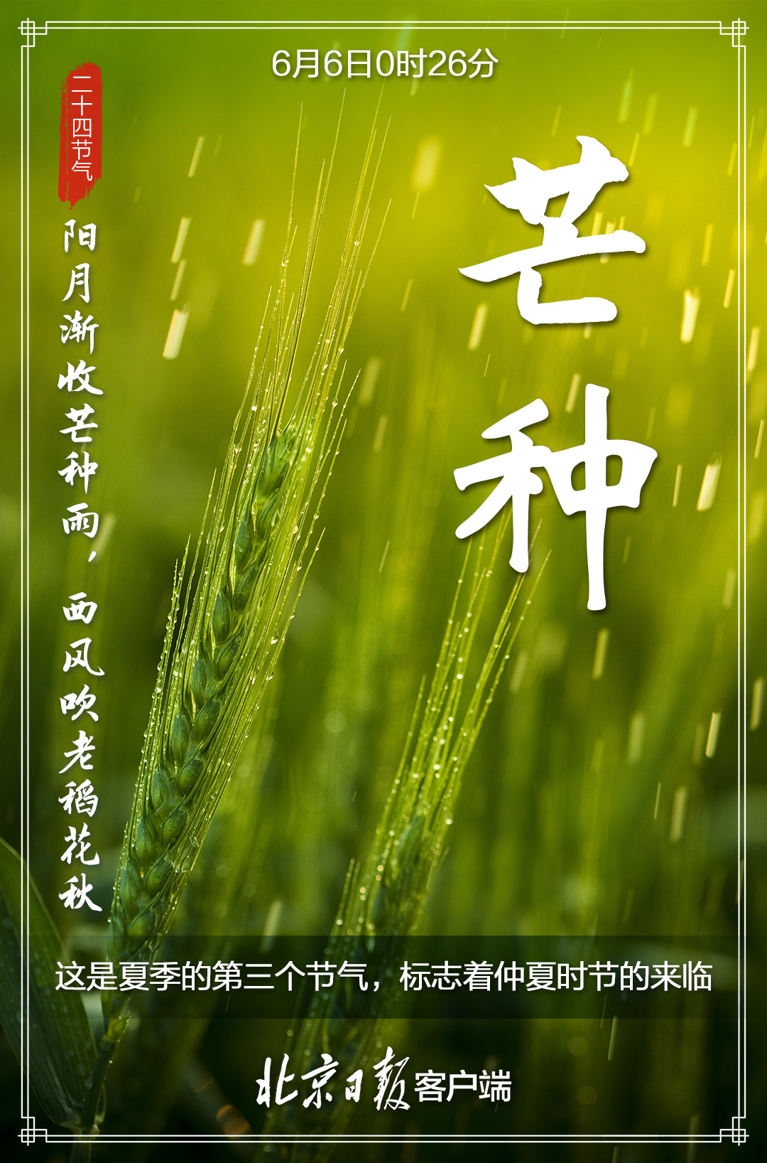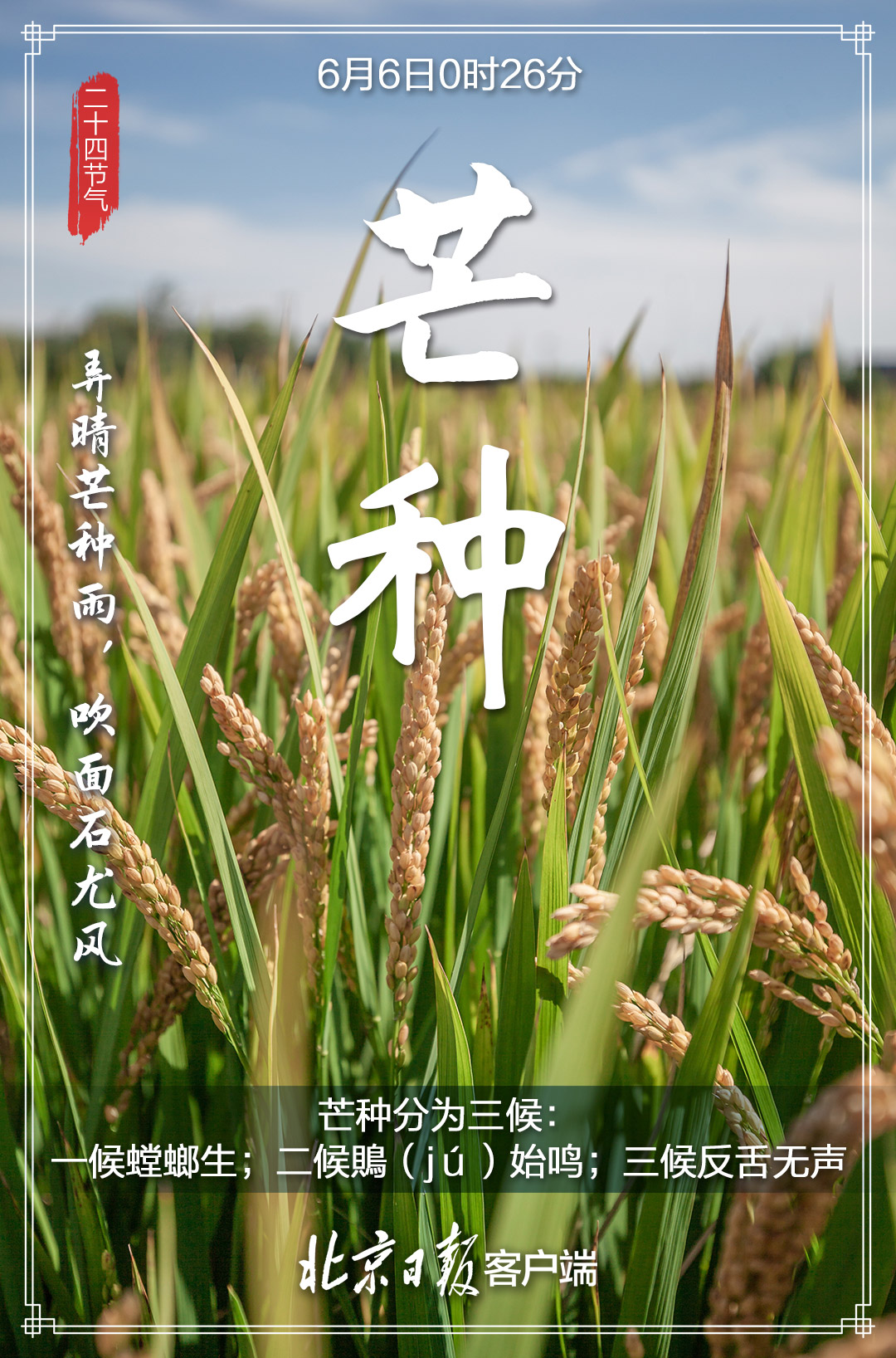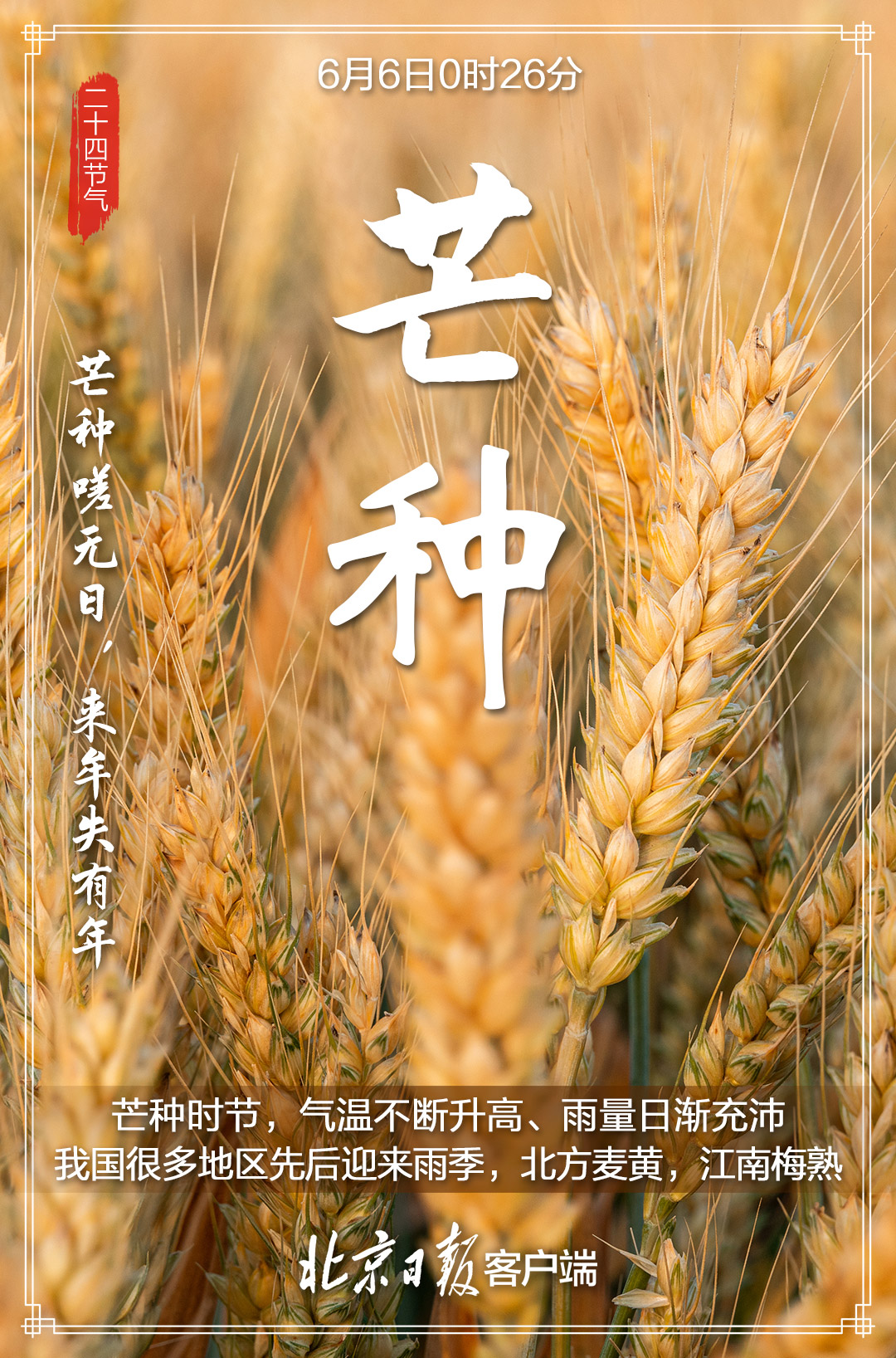6月6日,迎来“芒种”节气,标志着一年仲夏的开始。每到此时,北方麦黄,江南秧绿。  “芒种忙,麦上场。”“芒种芒种,连收带种。”这个时节,也是农业耕种最忙的季节,我国大江南北“栽秧割麦两头忙”,农业生产处于“夏收、夏种、夏管”的“三夏”大忙时节。“时雨及芒种,四野皆插秧”,一幅幅生动的农忙画卷正在徐徐展开,因此“芒种”也称“忙种”。  芒种的“芒”指一些有芒的作物,如稻、黍、稷等;“种”,一为种子的“种”,二为播种的“种”。也就是说,芒种的含义是:“有芒之谷类作物可种,过此即失效”,所以才有了民谚“芒种不种,再种无用”。  芒种时节,我国气温显著升高、雨量充沛、空气湿度大,芒种节气成为了种植农作物时机的分界点。在稻作地区的南方,“芒种”是插秧的忙碌时节;而以旱地农业为主的北方,主要的粮食作物则是小麦,这个时节正是北方夏熟作物麦子收获之时。所以,在这一轮农忙中,北方地区的人们正忙着收麦,而南方地区的人们则忙着插秧种稻。正可谓,芒种之时,“有芒的麦子快收,有芒的稻子可种”。  古代将芒种分为三候:“一候螳螂生;二候鹏始鸣;三候反舌无声。”在这一节气中,螳螂在去年深秋产的卵因感受到阴气初生而破壳生出小螳螂;喜阴的伯劳鸟开始在枝头出现,并且感阴而鸣;与此相反,能够学习其它鸟鸣叫的反舌鸟,却因感应到了阴气就会停止鸣叫。  “芒种忙种,有收有种”,这一“收”一“种”,不仅道出了芒种节气的内涵,也道出了人生的真谛——人生大事,不过种和收;有种,才有收;种好,才能收好。 芒种时节,民间有安苗、打泥巴仗、煮梅等风俗。 安苗。每到芒种时节,种完水稻,为祈求秋天有个好收成,各地都要举行安苗祭祀活动。家家户户用新麦面蒸发包,把面捏成五谷六畜、瓜果蔬菜等形状,然后用蔬菜汁染上颜色,作为祭祀供品,祈求五谷丰登、村民平安。  打泥巴仗。贵州东南部一带的侗族青年男女,每年芒种前后都要举办打泥巴仗节。当天,新婚夫妇由要好的男女青年陪同,集体插秧,边插秧边打闹,互扔泥巴。活动结束,检查战果,身上泥巴最多的,就是最受欢迎的人。  煮梅。在南方,每年五、六月是梅子成熟的季节,三国时有“青梅煮酒论英雄”的典故。青梅含有多种天然优质有机酸和丰富的矿物质,具有净血、整肠、降血脂、消除疲劳、美容、调节酸碱平衡,增强人体免疫力等独特营养保健功能。但是,新鲜梅子大多味道酸涩,难以直接入口,需加工后方可食用,这种加工过程便是煮梅。 芒种期间的饮食宜以清补为主,顾脾胃,少寒凉,同时要吃苦饮酸。这是因为一般苦味的食物具有清热解暑燥湿功效,吃一些苦味的食物例如苦瓜、莲子、芥蓝、荞麦、生菜、苦菊等,正所谓“苦夏食苦夏不苦”。而酸味食物具有生津、敛汗的作用。 来源:北京日报客户端 | 记者 骆倩雯 美编 关印