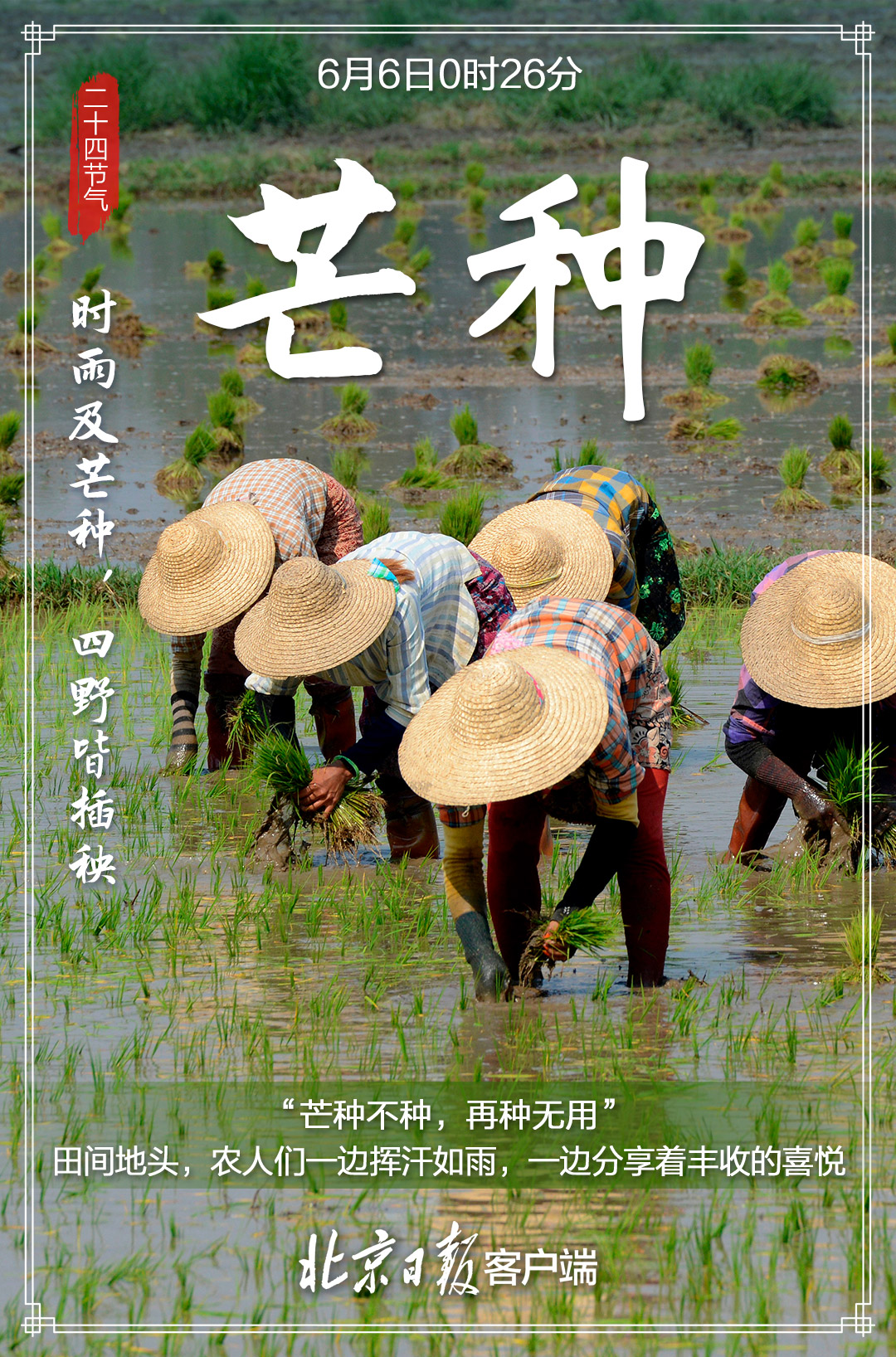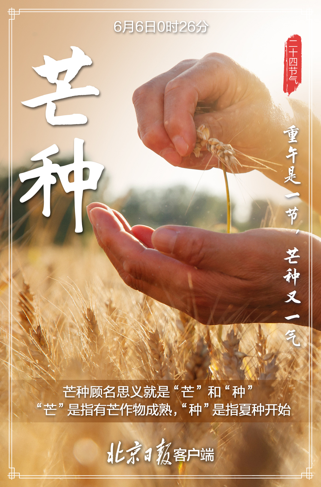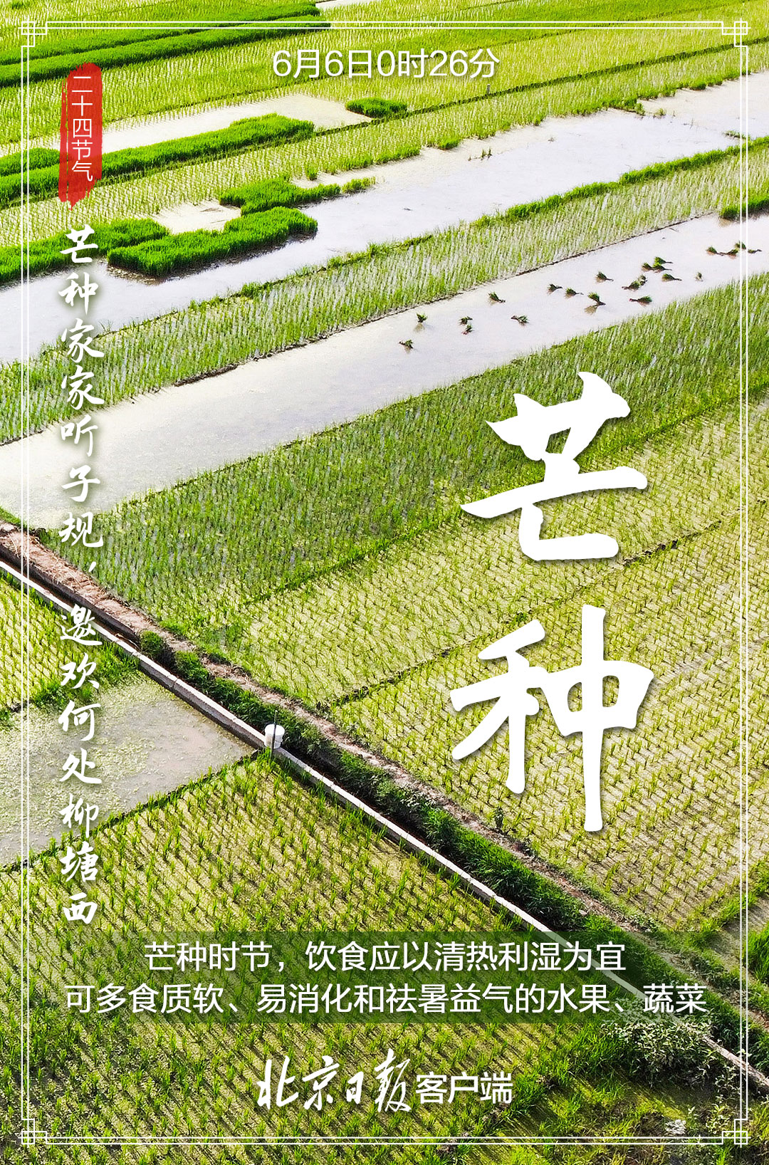 6月6日,迎来“芒种”节气,标志着一年仲夏的开始。每到此时,北方麦黄,江南秧绿。  “芒种忙,麦上场。”“芒种芒种,连收带种。”这个时节,也是农业耕种最忙的季节,我国大江南北“栽秧割麦两头忙”,农业生产处于“夏收、夏种、夏管”的“三夏”大忙时节。“时雨及芒种,四野皆插秧”,一幅幅生动的农忙画卷正在徐徐展开,因此“芒种”也称“忙种”。  芒种的“芒”指一些有芒的作物,如稻、黍、稷等;“种”,一为种子的“种”,二为播种的“种”。也就是说,芒种的含义是:“有芒之谷类作物可种,过此即失效”,所以才有了民谚“芒种不种,再种无用”。  芒种时节,我国气温显著升高、雨量充沛、空气湿度大,芒种节气成为了种植农作物时机的分界点。在稻作地区的南方,“芒种”是插秧的忙碌时节;而以旱地农业为主的北方,主要的粮食作物则是小麦,这个时节正是北方夏熟作物麦子收获之时。所以,在这一轮农忙中,北方地区的人们正忙着收麦,而南方地区的人们则忙着插秧种稻。正可谓,芒种之时,“有芒的麦子快收,有芒的稻子可种”。  古代将芒种分为三候:“一候螳螂生;二候鹏始鸣;三候反舌无声。”在这一节气中,螳螂在去年深秋产的卵因感受到阴气初生而破壳生出小螳螂;喜阴的伯劳鸟开始在枝头出现,并且感阴而鸣;与此相反,能够学习其它鸟鸣叫的反舌鸟,却因感应到了阴气就会停止鸣叫。  “芒种忙种,有收有种”,这一“收”一“种”,不仅道出了芒种节气的内涵,也道出了人生的真谛——人生大事,不过种和收;有种,才有收;种好,才能收好。 芒种时节,民间有安苗、打泥巴仗、煮梅等风俗。 安苗。每到芒种时节,种完水稻,为祈求秋天有个好收成,各地都要举行安苗祭祀活动。家家户户用新麦面蒸发包,把面捏成五谷六畜、瓜果蔬菜等形状,然后用蔬菜汁染上颜色,作为祭祀供品,祈求五谷丰登、村民平安。  打泥巴仗。贵州东南部一带的侗族青年男女,每年芒种前后都要举办打泥巴仗节。当天,新婚夫妇由要好的男女青年陪同,集体插秧,边插秧边打闹,互扔泥巴。活动结束,检查战果,身上泥巴最多的,就是最受欢迎的人。  煮梅。在南方,每年五、六月是梅子成熟的季节,三国时有“青梅煮酒论英雄”的典故。青梅含有多种天然优质有机酸和丰富的矿物质,具有净血、整肠、降血脂、消除疲劳、美容、调节酸碱平衡,增强人体免疫力等独特营养保健功能。但是,新鲜梅子大多味道酸涩,难以直接入口,需加工后方可食用,这种加工过程便是煮梅。 芒种期间的饮食宜以清补为主,顾脾胃,少寒凉,同时要吃苦饮酸。这是因为一般苦味的食物具有清热解暑燥湿功效,吃一些苦味的食物例如苦瓜、莲子、芥蓝、荞麦、生菜、苦菊等,正所谓“苦夏食苦夏不苦”。而酸味食物具有生津、敛汗的作用。 来源:北京日报客户端 | 记者 骆倩雯 美编 关印