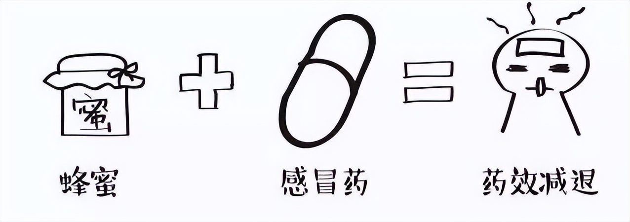 复方感冒药如泰诺、快克、感立克、感冒清等都含有对乙酰氨基酚,遇到蜂蜜(蜂蜜呈酸性,pH值约为3.9)会使得对乙酰氨基酚发生水解反应,生成醋酸跟氨基酚,减弱退烧作用。