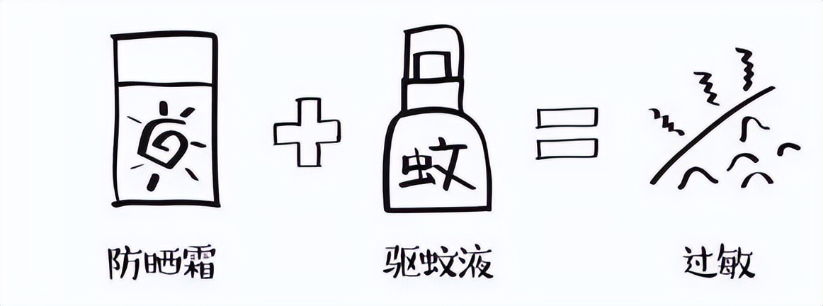 驱蚊液的主要成分为避蚊胺和酒精,而防晒霜中含有二苯甲酮,大量的避蚊胺、酒精和二苯甲酮混合,高温还促进皮肤吸收这些化学成分,引起过敏。