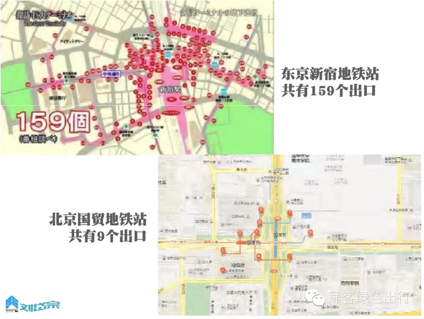 让我们再以北京为例,北京的国贸地铁站共有9个出口,对比东京新宿地铁站共有159个出口。地铁出口越多,意味着,用公共交通工具和步行方式可以便捷到达的覆盖范围越大,人们可以采用公共交通和步行而不是开小汽车的方式去购物,办事和上班。