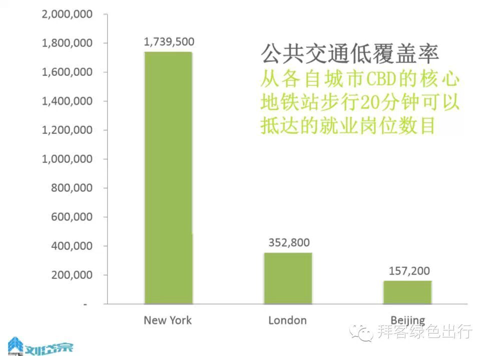 下面是另外一个对比,对比在纽约,伦敦和北京三地,从各自城市CBD的核心地铁站步行20分钟可以抵达的就业岗位数目。调查结果显示,纽约核心地铁站步行20分钟可覆盖173.9万个就业岗位,北京只覆盖15.7万个,纽约是北京的11倍。