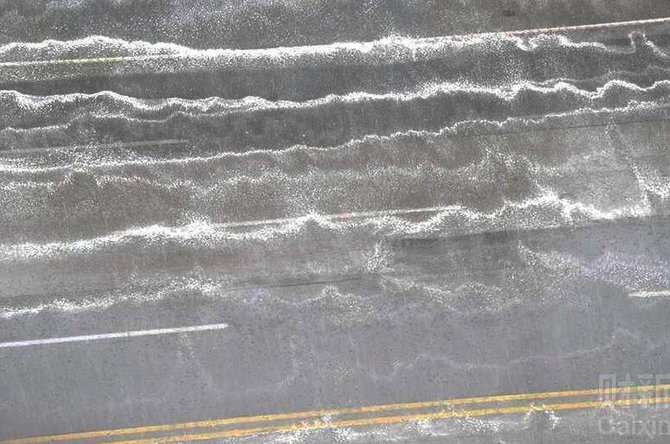 蓝鲸财经记者工作平台微博:天津爆炸事故后首次降雨,路面现大量白色泡沫。