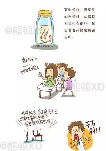 今天吐翻了,医生说是好现象。因为化疗反应在我身上,说明肿瘤“那小子”也够呛!所以自由的吐吧!嗷嗷嗷! 这几天疼得厉害,躺不下来,睡觉也只有坐着,结果屁股承重过大极其酸麻,灵机一动想了个办法,坐在马桶上,把屁股部分空出来减少压力,还真灵! 打了两针吗啡,总算睡着了,以为会有什么幻觉啊!快感啊!统统没有,就是整个睡过去……失望。 今天果然换方案,要再置个PICC管,以后治疗就是“双管齐下了”。 我妈现在变成了紧张大师。我咳嗽一声,她就睡不着觉;我擤个鼻涕,她就添两根白头发;甚至我流点汗,她也急得团团转,想不通我流的是什么汗,是不是病又犯了什么的……我都快崩溃了,不过想想也对,人家现在可是几十万重金打造的身体,能不金贵吗? …… 这些诙谐的文字,出自年仅30岁的恶性淋巴瘤患者——《滚蛋吧!肿瘤君》的作者熊顿(网名)。 这位自称很爷们的南方小女子,把自己治疗肿瘤的过程,用漫画形式在网站上连载,点击量超过了200万次。在她的漫画中把痛苦的胸腔穿刺,描绘成从胸口勾出两条虫子;把化疗后严重掉发,幻想长出像秀兰·邓波儿那样的卷发。 乐观、幽默、坚强的熊顿派作风,彻底颠覆了大家对癌症的认识,积极乐观的漫画给人带来了很多欢乐。有网友评论道,看漫画时不是被戳中笑点就是被戳中泪点。同时她对癌症的态度也引起了癌友的共鸣:“打败身体里的肿瘤君!”