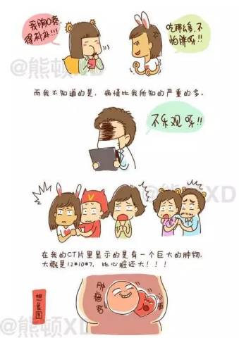 熊顿的主治医生、北京肿瘤医院淋巴肿瘤内科宋玉琴医生也被她的乐观所感动:通过画漫画可适当转移治疗中的痛苦感受,对她的病情康复和治疗很有帮助。 熊顿所患的是非霍金淋巴瘤,近几年来发病率明显上升,直接发病原因目前尚不清楚,但诱发因素主要有工作压力大、生活习惯不良、环境污染、机体免疫功能低下以及社会老龄化等。 从没想过自己也会得癌