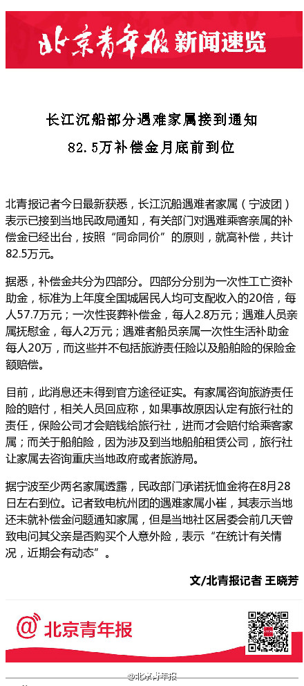 @北京青年报:【长江沉船部分遇难者家属将获赔82.5万元】北青报记者今日获悉,长江沉船遇难者家属(宁波团)表示已接到当地民政局通知,有关部门对遇难乘客亲属的补偿金已经出台,按照“同命同价”的原则,就高补偿,共计82.5万元,而这并不包括旅游责任险以及船舶险的保险金额赔偿。(北青报记者王晓芳)
