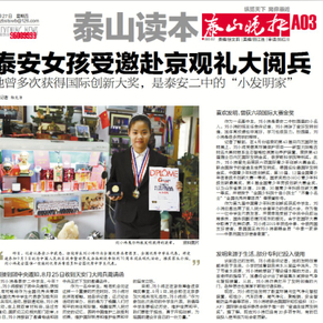 她曾多次获得国际创新大奖,是泰安二中的“小发明家” 最泰安泰山晚报供稿 本报记者 杨文洁 昨日,记者从泰安二中获悉,该校学生刘小祎作为全国优秀共青团员、全国优秀中学生代表,将受邀参加9月3日纪念中国人民抗日战争暨世界反法西 斯战争胜利70周年阅兵观礼活动。据其家长介绍,刘小祎是全国惟一受邀的优秀共青团员和全国优秀中学生代表。 7月接到团中央通知,8月25日收到天安门大阅兵邀请函 刘小祎是泰安二中学生,今年7月份,刘小祎接到了团中央通知,获知自己有可能将作为全国优秀共青团员、全国优秀中学生代表参加胜利日大阅兵 观礼活动。接到通知后,刘小祎很激动。在上报政审材料后,经过市级、省级、国家级三级相关部门政审,8月25日,刘小祎接到了邀请电话和团中 央正式下发的邀请函件。 作为一名中学生,能有机会见证这样一个重要的历史时刻,刘小祎对此深有感触。她告诉记者,这次纪念活动的举办,目的是为了唤醒人们对和平 的向往和珍惜,唤醒世界人民对历史的记忆,表明中国维护二战胜利成果,维护国际秩序和维护世界和平的坚定立场。 目前,刘小祎正在紧张筹备进京相关事宜,9月1日,她会前往北京参加大阅兵观礼活动。刘小祎说:“作为参加此次活动的中学生代表,我倡导中 学生要铭记历史,维护世界和平,我们要敢于担当,勇于开拓创新,为祖国的建设尽自己的一份力量。” 喜欢发明,曾获六项国际大赛金奖 作为一名高中生,刘小祎是泰安二中校园里的小名人。刘小祎的班主任告诉记者,刘小祎除了爱好发明创造,她体育成绩也非常好,学习也很努力 。校园里,刘小祎是很多同学的榜样。 记者了解到,在4月份结束的第43届日内瓦国际发明展上,刘小祎凭借其环境保护项目——新型太阳能古树名木果树根系生态智能检测复壮养护装 置,荣获第43届瑞士日内瓦国际发明金奖,俄罗斯科学院特别奖。此外,刘小祎曾先后荣获六项国际青少年创新大赛金奖,联合国授予的爱迪生世界 发明奖,德国纽伦堡国际发明金奖,中国青少年科技创新奖,第10届、12届全国青少年信息技术创新大赛一等奖,国家奖励办NOC青少年科技创新最 高奖,第6届全国青少年劳技创新大赛金奖,以及山东省第28届、29届、30届青少年科技创新大赛一等奖,并被授予“全国少科院十佳小院士”“齐 鲁小名士”“全国优秀共青团员”等荣誉称号。 作为第九届中国青少年科技创新奖获奖中学生,刘小祎应邀出席了在人民大会堂举办的颁奖大会,作为惟一一位中学生代表发言,并荣幸地受到了 中共中央政治局委员、国务院副总理刘延东的接见。由于在国际大赛中取得了优异成绩,刘小祎2015年获选中泰、中俄两国友好使者,泰国国王向刘 小祎御赐金质“中泰一家亲——中泰两国友好使者徽章”。 发明来源于生活,部分专利已投入使用 谈到自己的发明,刘小祎告诉记者,她的发明创意都来自于生活。小学时她看到自来水从面盆中流失,为了节省水资源,刘小祎就想到了增设储水箱 的方法。且在老师的指导下,她最终设计出了新型集水减排空气净化智控装置。从此,刘小祎仿佛打开了发明创造的大门,各种想法也源源不断地付 诸实践。 现在,刘小祎已经发明了教室环境与空气净化智控装置、磁性沙、汽车防滑、尾气净化、聚能锅、安全智能防盗井盖等项目。刘小祎被联合国国际 知权组织(KIAF)国际联合组织委员会授予惟一的“爱迪生世界发明奖”。据了解,现在刘小祎已经有20多项专利,有的已经投入使用在为社会做贡 献。
