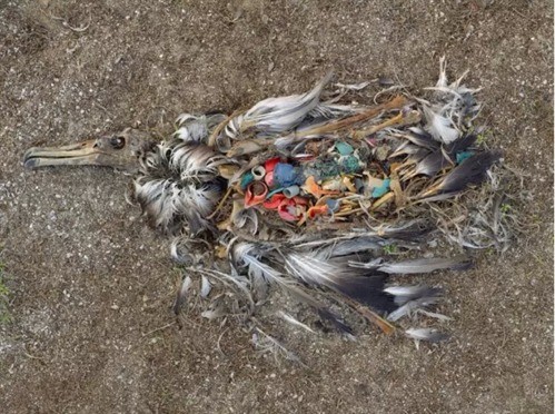 在远离人类繁华世界的中途岛,因误食过多的塑料而死亡信天翁,在沙滩上腐化后可见体内大量的塑料件;这是在偏远的岛屿常见的景象。