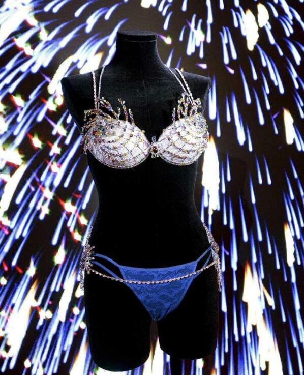 当地时间2015年11月2日,美国加利福尼亚州圣莫尼卡,维多利亚的秘密店铺展示出了一件价值200万美元的梦幻胸衣,这件被誉为“烟花梦幻胸衣”将超过6500颗闪烁的钻石、托帕石(蓝色),黄宝石和粉色石英石镶嵌在18K的黄金里。