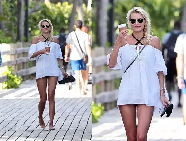 同样的,被称为德国甜心的模特莉娜-格尔克抹胸连身裙小露香肩秀美腿,大秀了一把“下装消失”风。
