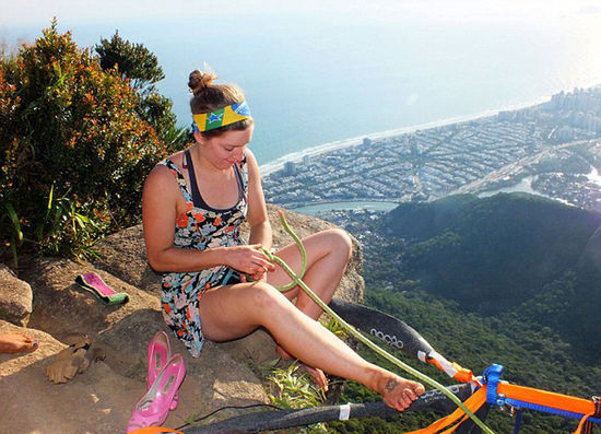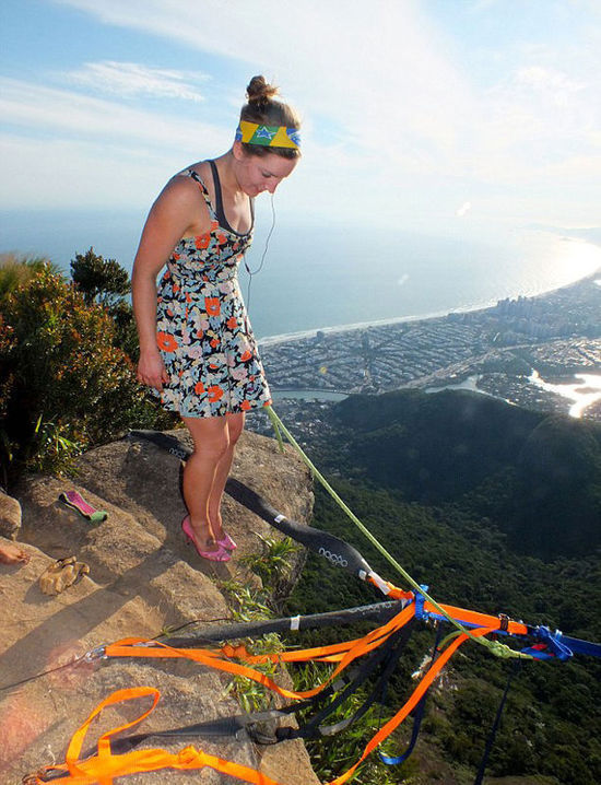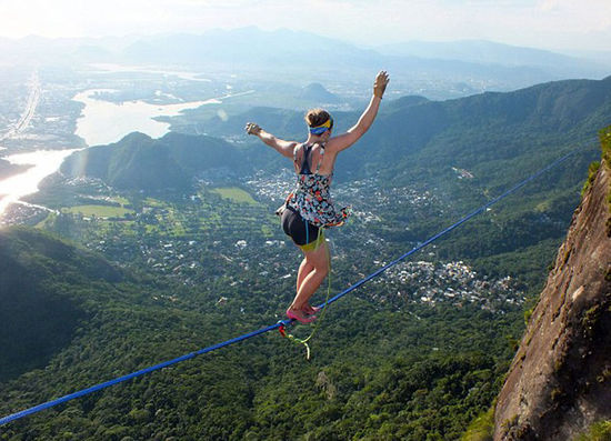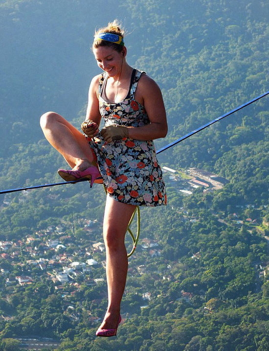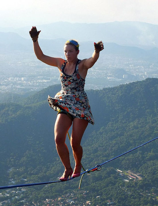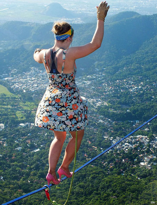 美国杂技演员迪基在巴西里约热内卢Pedra da Gávea山顶表演穿高跟鞋高空走钢索绝技。(网页截图) 摄影师雷金纳德·戈梅斯拍摄到迪基穿高跟鞋走钢索的照片。他说:“迪基的行为给所有人都留下深刻印象,她的笑容和从容赢得了巴西人的心。”