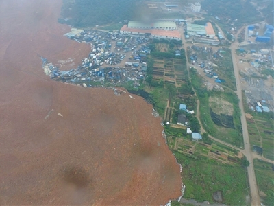 2015年12月20日航拍的事故现场。红褐色泥土包围建筑。新华社发