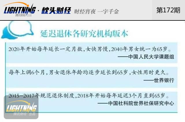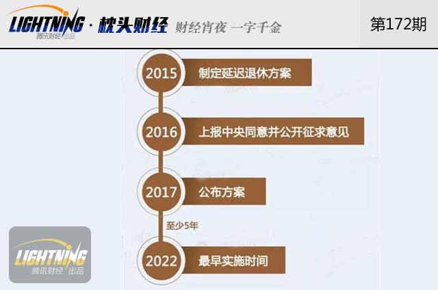 【渐进式延迟退休】那么问题来了,养老改革能一步到位吗?对此,人社部部长尹蔚民表示,延迟退休政策最根本的原则,是“小步慢走,渐进到位”,为了给公众做好心理准备的时间,政策出台后至少五年,才会渐进式实施。去年年底,社科院所发布的《人口与劳动绿皮书》中则建议,从2018年开始实施延迟退休,女性退休年龄每3年延迟1岁,男性退休年龄每6年延迟1岁,直至2045年同时达到65岁。
